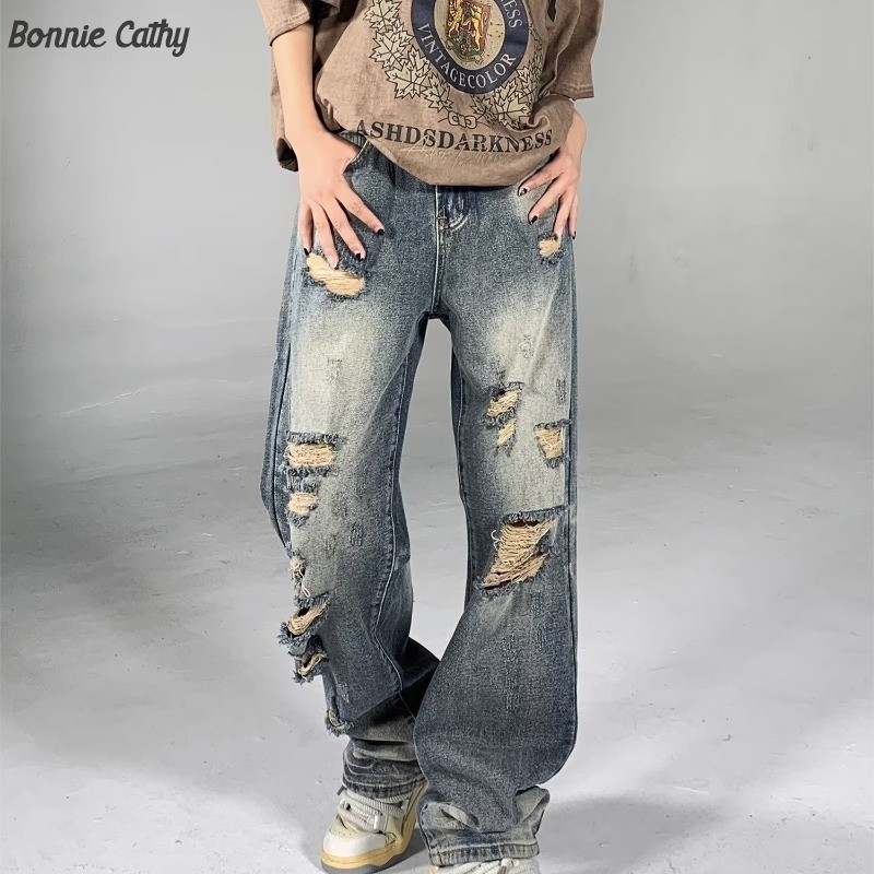 Bonnie Cathy American vintage wash to do old ripped jeans male ins high street fashion brand loose straight tube street pants Shopee Philippines Very well made.