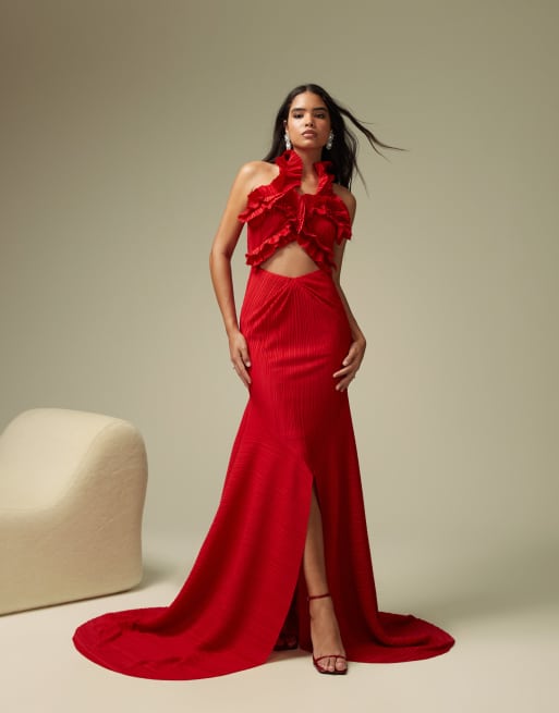 ASOS DESIGN Robe longue de qualite superieure a volants et buste plisse avec traine Rouge ASOS Very well made.