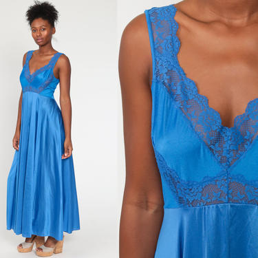 Women Fashion Plunge V neck Sexy Sleepwear Sleeveless Solid Royal Blue Dress Nightgown women Mid Calf nightdress Home Negligees Very well made.